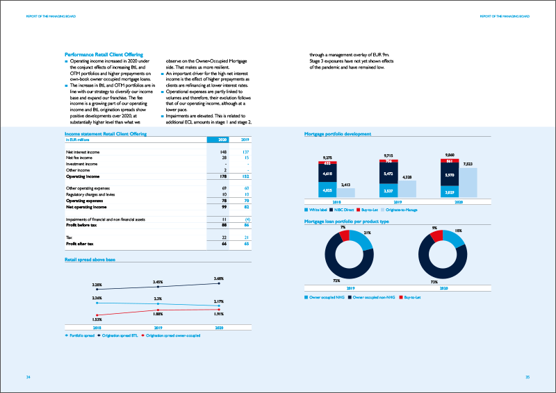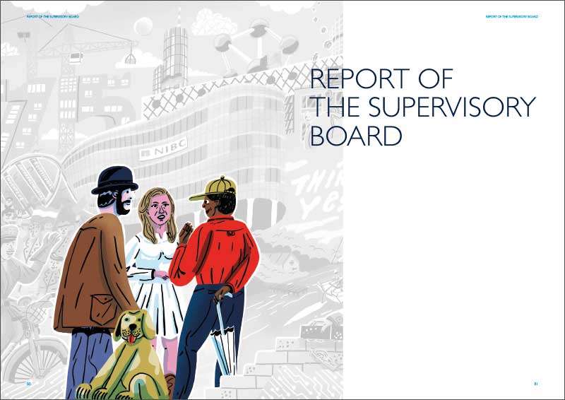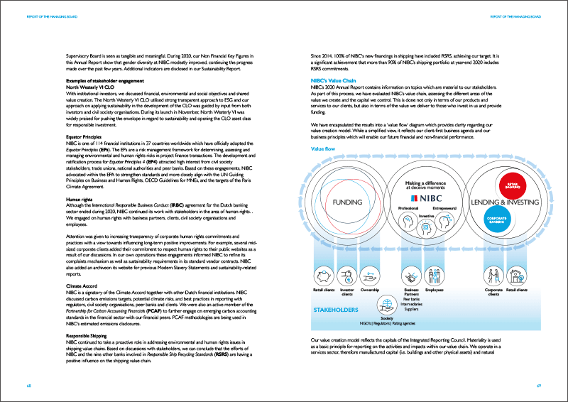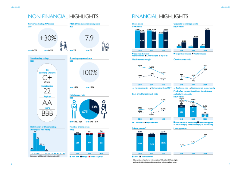 Het jaarverslag 2020 van NIBC is geproduceerd met het CMS van Tangelo software. De redactie vult de content zelf in het CMS. Tabellen en grafieken worden met gesynchroniseerde bronbestanden gekoppeld en gegenereerd in de opmaak. Met de denkbeeldige druk op de knop rolt de pdf van de band.