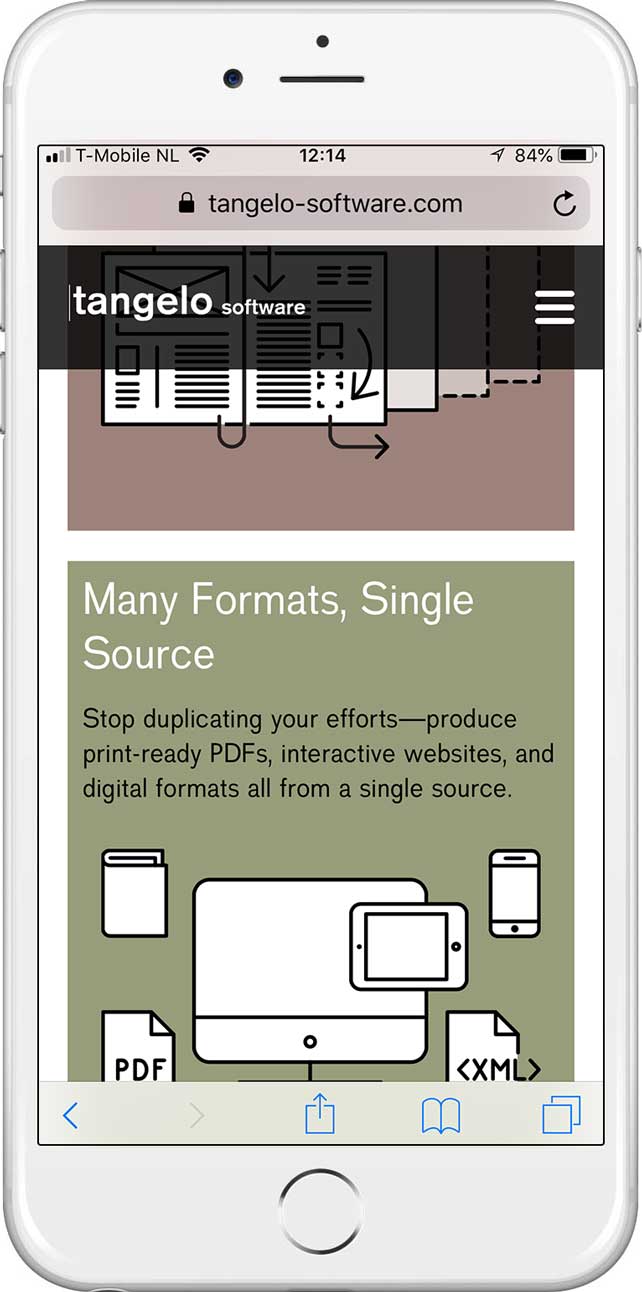 Uitgangspunt voor het ontwerp van de website is om de omvang beperkt, de werking functioneel en de stijl eenvoudig te houden. Home leidt je al scrollend langs de belangrijkste thema’s van Tangelo; de USP’s, bedrijfsvideo, personas, insights en de specifieke call-to-actions. Een soort scrollytelling. We vertellen het verhaal gedoseerd. Het menu is in eerste instantie niet zo belangrijk en onderaan het window geplaatst. Als we naar de onderzijde zijn gescrold, verhuist het menu naar de bovenzijde van het window.