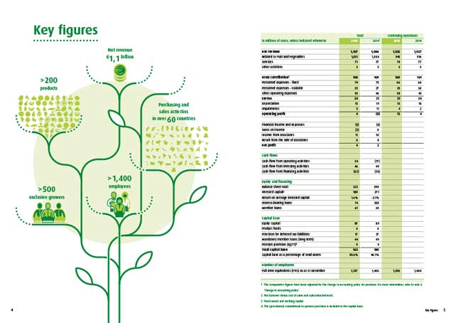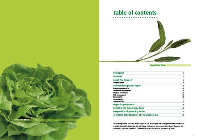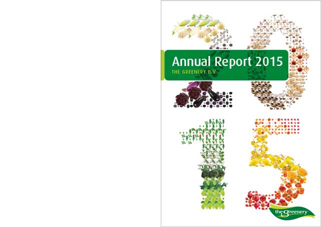 Voor het verslag van 2016 zijn we voor het ontwerp en de keuze van beeld vooral bij de core business van the Greenery gebleven: de producten. Door het hele verslag zijn die dan ook volop zichtbaar. Belangrijk detail: altijd voorzien van de volledige Latijnse naam. Voor het omslag resulteert dit in een barok spel van groente, paddenstoelen en fruit die het jaartal vormen. Het omslag van de jaarrekening is zakelijker en moet het alleen met een telraam van tuinbonen doen.